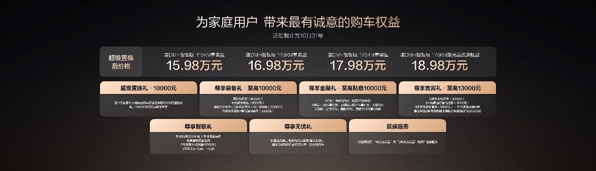 此次,唐DM-i智駕版 175KM長(zhǎng)續(xù)航版共推出3款車(chē)型,售價(jià)17.98萬(wàn)~19.98萬(wàn)元(10月31日前完成購(gòu)車(chē)可享10000元置換補(bǔ)貼)。同時(shí),比亞迪還為用戶準(zhǔn)備了包含置換補(bǔ)貼在內(nèi)的至高價(jià)值4.3萬(wàn)元盛唐禮遇。