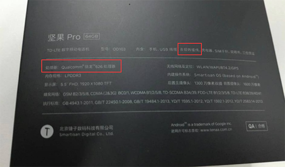 這不很快便有網友曝光了錘子千元機戰場接班人堅果Pro的包裝盒,從包裝盒上我們能一窺堅果Pro的相關信息:型號為OD103、沒有了3.5mm耳機接口(附贈了音頻轉接線可以看出)、搭載高通驍龍626的處理器、5.5英寸1080P的TFT屏幕、支持全網通、攝像頭為1300w+1600w的組合、64GB的存儲等。
