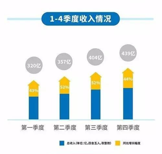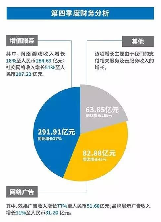 就在昨天騰訊終于為外界解開了去年財(cái)報(bào)收入的神秘面紗:2016年全年,騰訊總收入為人民幣1519.38億元(約合219.03億美元),比去年同期增長(zhǎng)48%。第四季度營(yíng)收為438.64億元(約合63.23億美元),比去年同期增長(zhǎng)44%。