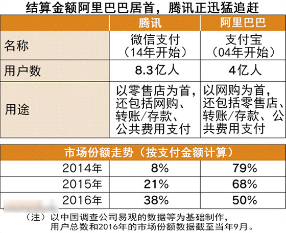 關(guān)于上文那個問題已經(jīng)在日經(jīng)中文網(wǎng)給出了答案:根據(jù)易觀國際等調(diào)查公司的數(shù)據(jù)顯示,截止至2016年9月騰訊微信的用戶數(shù)為8.3億,而阿里巴巴的支付寶為4億,可以看出微信支付的用戶遠(yuǎn)超支付寶用戶。