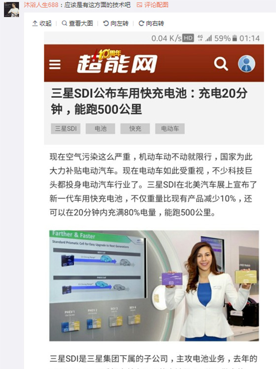 雖然后來爆料人i冰宇宙表示這圖可能是假的,但是很快遭到網友的反駁,并曬出三星SDI公司的黑科技報道圖,車用快充電池能夠充20分鐘,跑500公里,三星的Galaxy s charge+可能用的就是SDI的黑科技了。