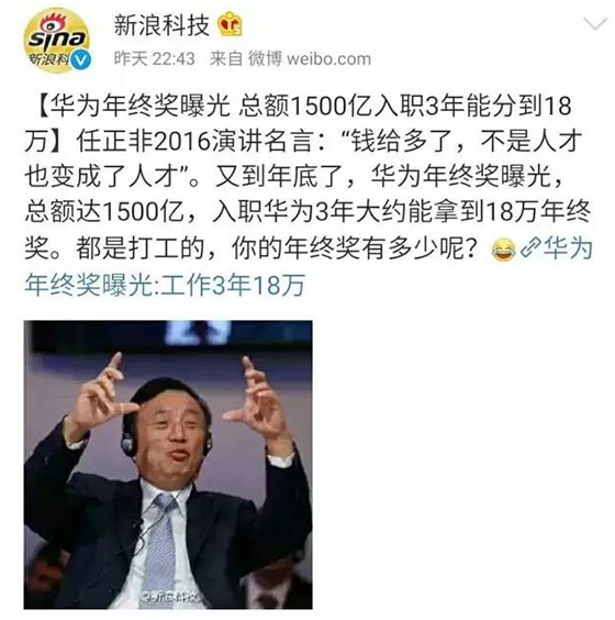 我們在回到前面的1500億年終獎問題,華為2016年收入為5216億,刨去各項支出,凈利潤為371億,若華為去年真的發了1500億年終獎的話,這371億的凈利潤明顯還不夠塞牙縫的,華為還虧了不少,很明顯華為沒有發所謂的1500億年終獎。