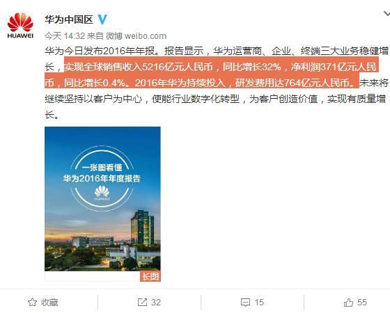 今天華為官方正式公布了它的2016年的財報,報告顯示,華為運營商、企業、終端三大業務穩健增長,實現全球銷售收入5216億元人民幣,同比增長32%,凈利潤371億元人民幣,同比增長0.4%。2016年華為持續投入,研發費用達764億元人民幣。