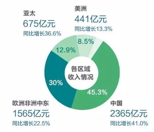此外從華為的財報也可以看出中國區的收入雖然占據大頭的地位,但是歐洲中東非洲、亞太等地區的收入正在趕超中國區的收入,從側面反映出華為國際化的成功,不再單純地依靠中國區了。