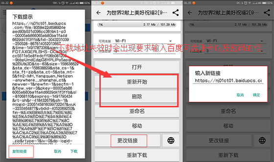 小編使用的H5瀏覽器(Nokia Symbian UA)+下載小助手的組合,下著下著下載地址就失效了,小編采取的方案則是重新去百度網盤資源頁面獲取下載鏈接并復制下來,之后進入到下載小助手頁面——點擊更改鏈接——把復制的鏈接粘貼進去即可,更改完鏈接之后,記得要輸入自己的百度網盤賬號以及密碼,之后就可以愉快的繼續下載了。