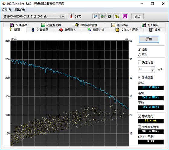 測試下來可以看到,硬盤的最高讀取速度為249.4MB/s,而最低讀取速度為115.2MB/s,平均速度為197.3MB/s。