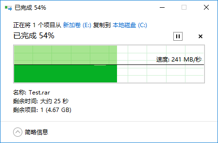10.2G文件從測試盤復制到C盤的速度為241MB/s。