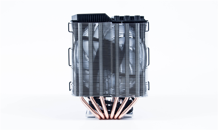 T620P RGB底座采用熱管直觸2.0技術,6根6mm銅質熱管直接接觸CPU表面,極大地增大了散熱面積。這一設計相比帶底座還有幾樣優點:1.降低了散熱器的高度,這點對于這個大家伙來說尤為重要;2.不鍍鎳更加環保。6根銅熱管通過穿Fin的方式與124片鋁質鰭片結合,被牢牢包裹,大大提高了散熱效率,能夠高效地導出熱量。