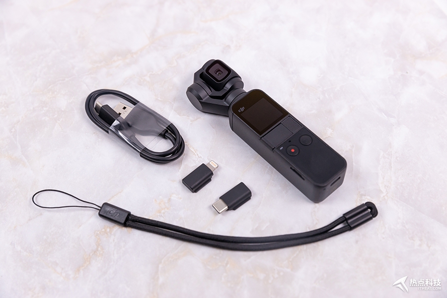 先要說明的是,我手上這款Osmo Pocket除了一根Type-C數據線,一個Lightning轉接頭和一個Type-C轉接頭外再無別的相關配件,所以只從官方標配的角度來體驗這款相機云臺。如果你想進一步提升Osmo Pocket的操控性能以及使用范圍,還可以選購一些豐富的配件,比如外接云臺控制撥輪就能實現通過撥輪進行云臺轉向的操控,延長桿和防水殼能實現Osmo Pocket的高角度或水下拍攝,音頻轉接頭可提升視頻的收音質量。具體選購哪些配件根據用戶自身需求考慮。