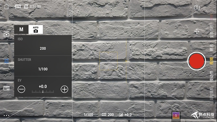 當然在手機連上App后,整個操控功能全部自動交給了手機,操控提升的效果立竿見影,不僅在視頻的構圖取景上看到了更清晰的畫面,并且手機也能更加方便的操控云臺轉向,并且還能自己調整ISO,快門速度和曝光補償等參數,實現更加專業的曝光參數進行拍攝。