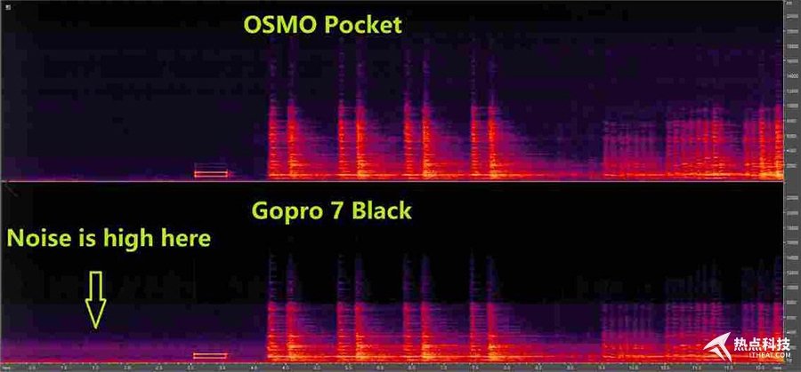 再來談及最后一個問題——收音效果,內置都麥克風靈敏度相當的高,在與運動相機Gopro Hero 7的內置麥克風對比中也是更勝一籌,從圖中對比可以看到Osmo Pocket的聲音抗噪能力要強出不少。并且DJI MIMO APP還還供了抗風噪功能,即使在刮風的情況下,用戶也無需擔心風噪效果,日常使用方面不用擔心收音問題。