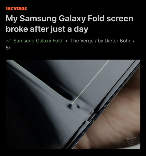 宋華飛 / 2019-04-18 12:07798586三星折疊屏手機Galaxy Fold即將于4月26日登陸北美,售價高達2000美元,CNBC、The Verge、彭博等多家美國媒體,先行拿到的評測試用機卻集體出現了故障。