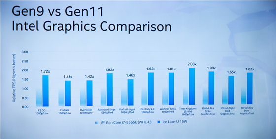 第十代酷睿處理器選擇了64EU版本的Iris Plus集成顯卡,在與第八代酷睿i7-8565U的對比中,雙方都將TDP限定在15W。測試結果顯示,Intel第11代GPU擁有遠超第9代產品的游戲性能,在1080P環境下的主流游戲中,其幀率表現均超越上代處理器40%-80%,個別甚至有著幀率翻倍的進步。