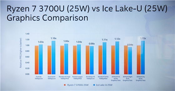 而在于Ryzen 7 3700U的對比中,雙方都將TDP全開到25W狀態。在對比中,除個別項目,第十代酷睿處理器的幀率表現普遍高于對手5%-15%左右。