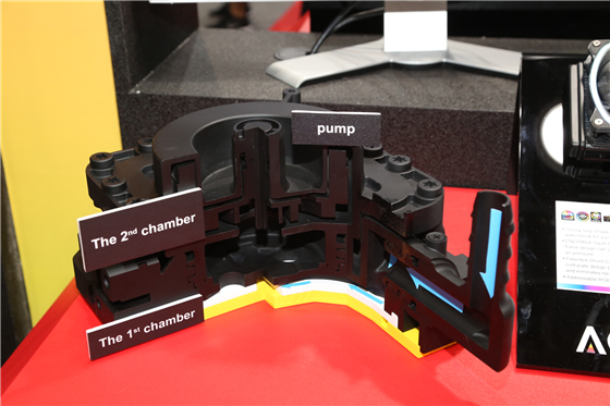 安耐美還展出了旗下的最新科技:雙腔體冷頭。雙腔體設計能夠有效提高散熱效率,并顯著延長冷頭壽命。安耐美旗下的AQUAFUSION一體式水冷就搭載了這一技術。