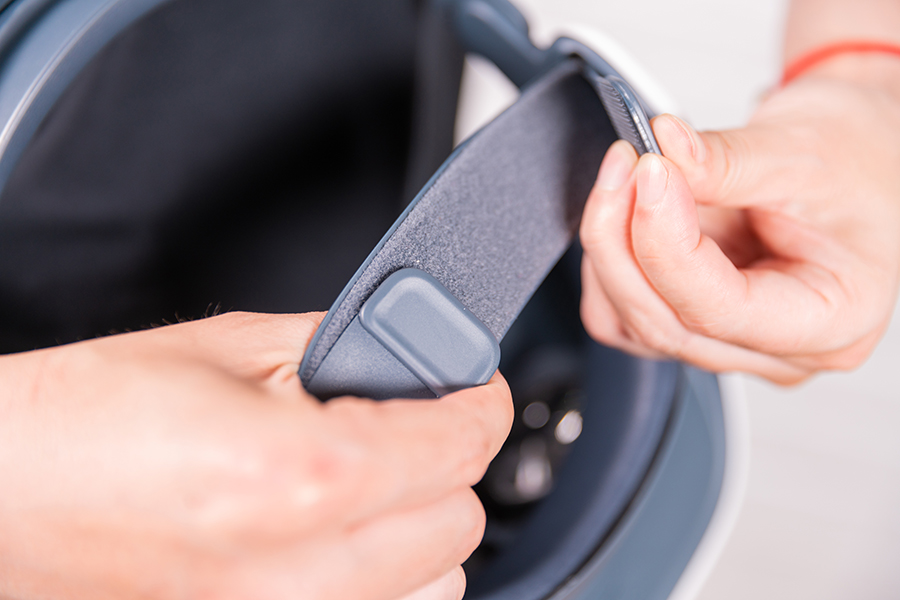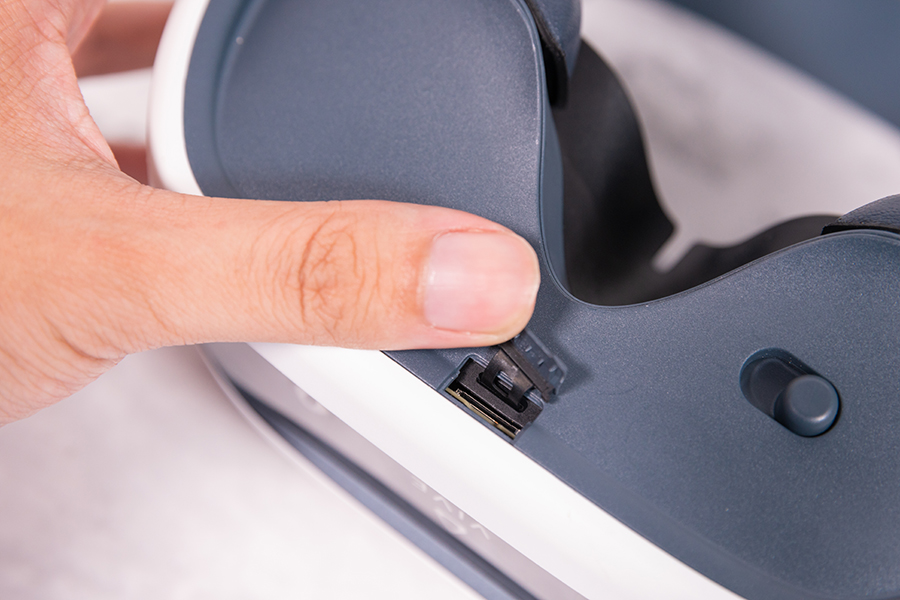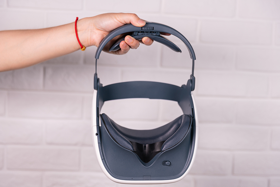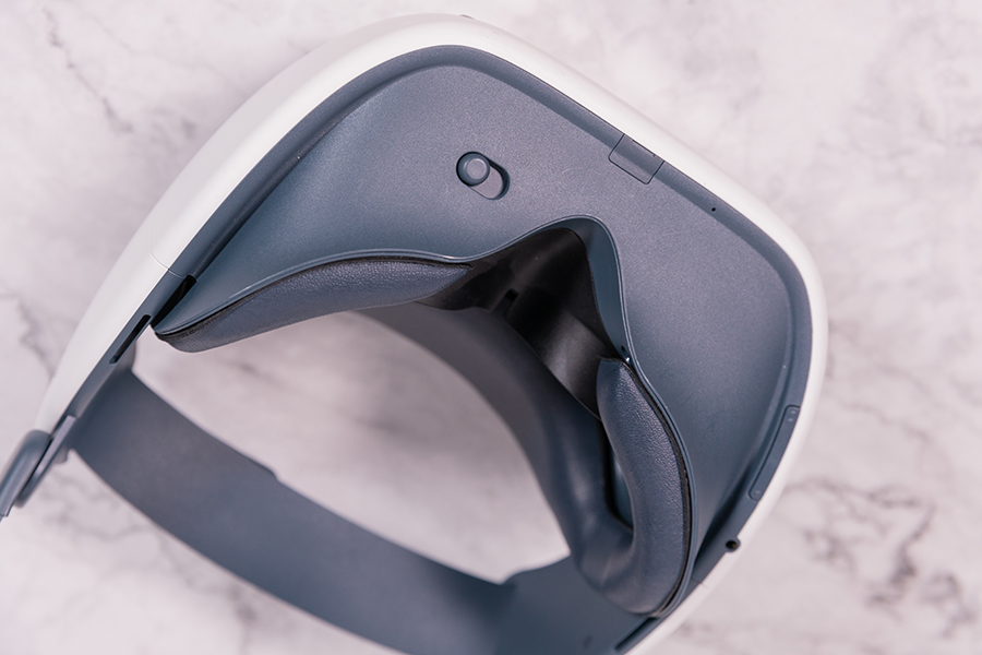 頭顯的后方帶有滾輪式的調整旋鈕調節頭顯佩戴時的松緊度,頭部的靠墊位置也能實現上下浮動的調整。雖然頭顯沒有屈光度的調節,可能有些戴眼鏡的用戶會覺得戴著眼鏡佩戴頭顯時會感受不適,影響頭顯的體驗,不過這點不必過于擔憂,因為頭戴采用了魔術貼的設計,用戶也可自行將頭戴調整到自己佩戴舒適且畫面清晰的位置。戴著眼鏡體驗VR設備是沒有問題的。