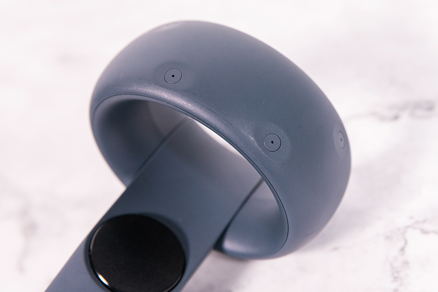 兩個手柄控制器不同于常見的遙控器,頂部帶有一個圓環的設計,在圓環的上方有著若干個小圓孔,這些位置都分布著追蹤感應器,我們在操控手柄時就是通過這些追蹤感應器實現類似于定位基站的功能,感應器的下方依次為圓形觸控板、菜單按鈕(左)、VIVE按鈕(右)、手柄的狀態指示燈以及VIVE的logo。