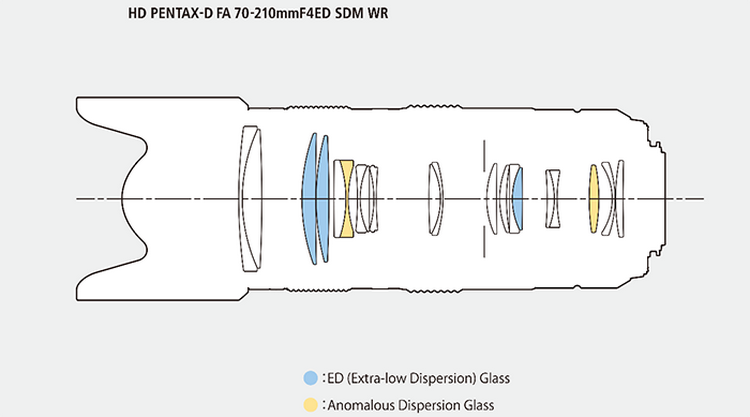 與原型鏡頭騰龍70-210mm F/4 Di VC USD一樣,HD PENTAX-D FA 70-210mm f/4 ED SDM WR是一支焦距為70-210mm、最大光圈恒定F4的望遠(yuǎn)變焦鏡頭,內(nèi)部由14組20片組成(包含3片ED低色散鏡片以及2片異常色散鏡片),使用了SDM對焦馬達(dá),最近對焦距離為0.95米,帶有對焦限位按鍵,濾鏡尺寸是67mm,鏡頭重819g。賓得鏡頭改變之處是使用了賓得自有的HD鍍膜,但考慮騰龍已經(jīng)掌握了納米鍍膜技術(shù),賓得多年沒有升級過鍍膜,賓得版鏡頭抗眩光效果不見得超出原版多少,因此HD PENTAX-D FA 70-210mm f/4 ED SDM WR最大改進(jìn)是更換了外殼,具備了防濺水功能以及能在零下10℃工作。