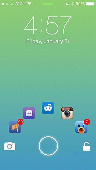 JellyLock為iOS的鎖屏界面增加了一個圓圈,通過不同方向的滑動可以預(yù)先設(shè)置解鎖、打開相機或者自定義的應(yīng)用(至多6個)。
