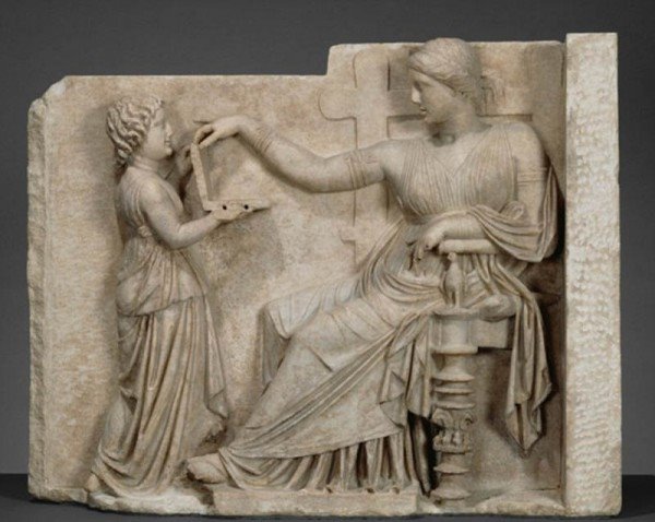 根據《每日郵報》報道,最近在美國加州博物館展出的一塊石板蠟像引起了軒然大波。為什么呢?是因為有一塊古希臘雕像顯示,一名坐在王座上的女人和仆人,仆人正在展示類似于筆記本電腦的東西,甚至還擁有類似于USB插口的兩個圓孔。