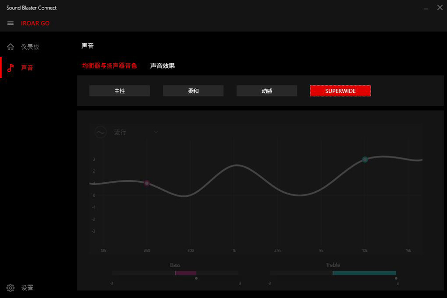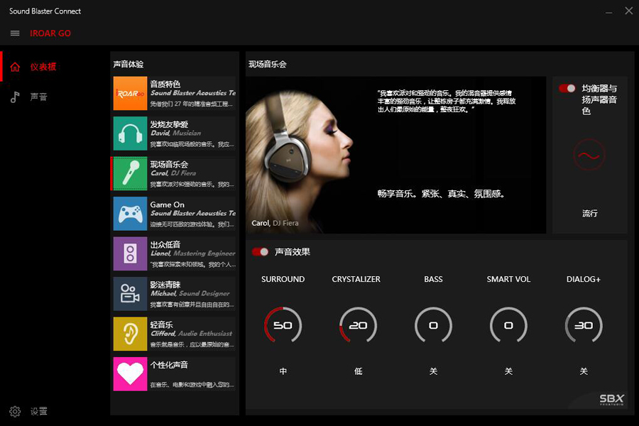 聲霸鑼智能移動版使用數據線和電腦連接充當電腦音箱后還可以搭配創新推出的配套軟件使用。軟件界面如上圖所示,除了預設有幾種音效場景模式,還支持用戶根據自己的喜好設置并保存自己喜歡的音效模式。