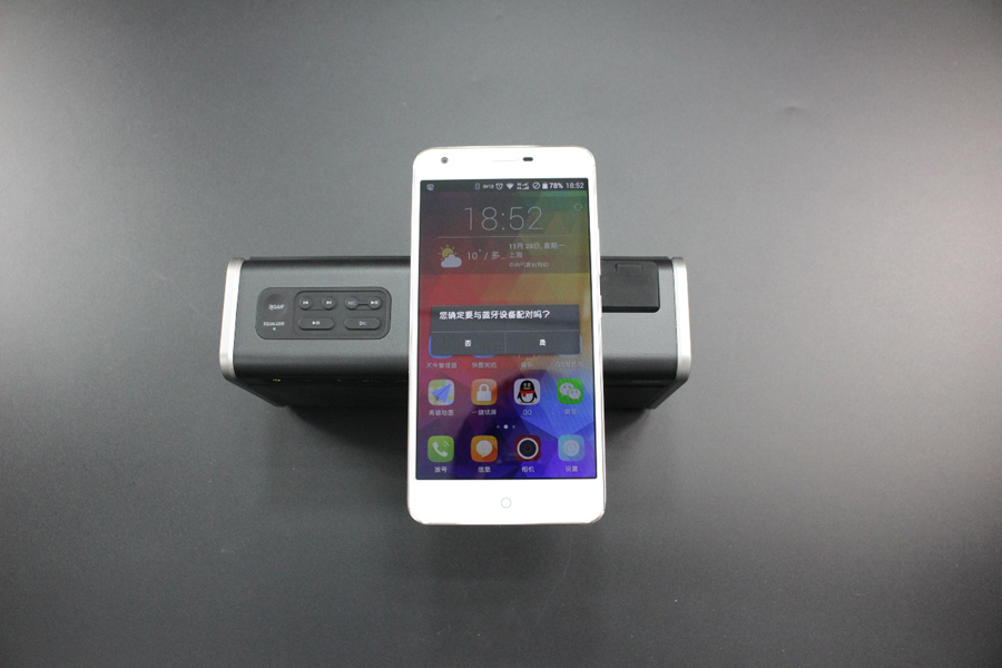 聲霸鑼智能移動版支持藍牙4.2,并且內置麥克風,可支持免提通話,充當車載藍牙使用。聲霸鑼智能移動版還支持NFC功能,當聲霸鑼智能移動版把藍牙打開之后,把具有NFC功能的手機同時把藍牙和NFC都打開,往聲霸鑼智能移動版頂部一靠,手機立馬會彈出一個是否連接聲霸鑼智能移動版藍牙音箱的選框,只要選擇“是”,藍牙立馬就能連接上。