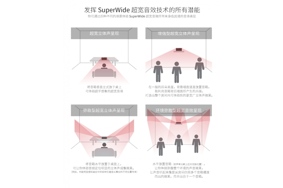 除了聲霸鑼系列標志性的ROAR鑼吼音效,聲霸鑼智能移動版還加入了SuperWide超寬音效技術。通過重復短按機身上的ROAR按鈕,可以在普通音效,鑼吼音效,SuperWide音效之間切換,EQUALIZER字樣下的藍燈亮起則表示SuperWide音效開啟。SuperWide音效根據擺放位置不同,產生的效果也有所不同,區別如上圖所示。聲霸鑼智能移動版也是聲霸鑼系列首款支持立放和平放兩種放置模式的藍牙音箱。