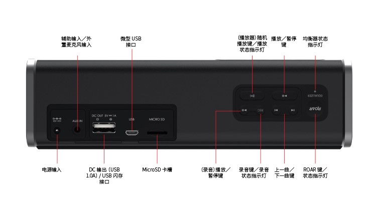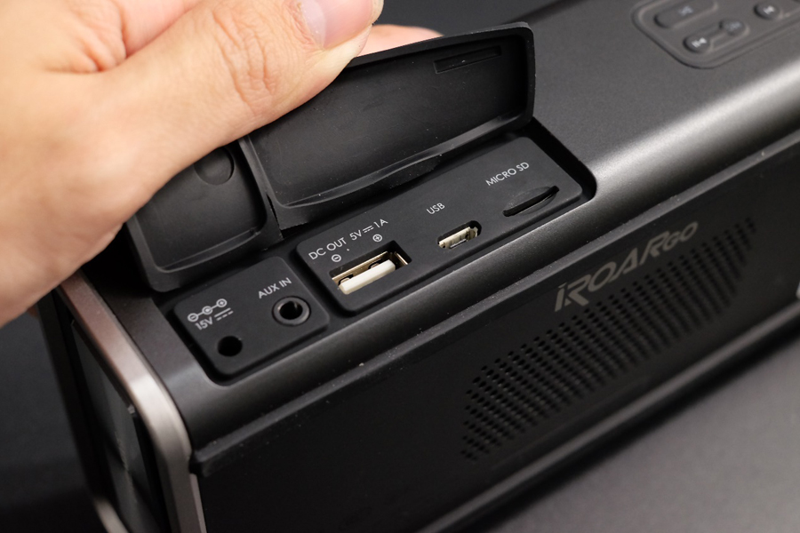 出于防水的設計,聲霸鑼智能移動版所有按鍵都是橡膠密封型按鍵,而對于有孔洞的接口則在外圈加了一層橡膠密封蓋做防護。聲霸鑼智能移動版的接口有一個圓形充電接口,一個3.5mm音頻接口,一個USB 2.0接口,一個Micro USB接口以及一個Micro SD卡插槽。USB 2.0接口支持DC 5V/1A輸出,也就是說聲霸鑼智能移動版可以充當移動電源為手機或平板等設備充電,這雖然不是什么很新奇的功能,但某些情況下可能會起很大作用。另外USB 2.0接口還可以用來連接U盤,可直接播放存儲在U盤中的音樂。聲霸鑼智能移動版可以通過有線方式連接電腦充當電腦音箱使用,只要拿數據線把聲霸鑼智能移動版的Micro USB接口可與電腦上的USB接口相連就可以了,操作非常簡單。Micro SD卡插槽最大32GB容量的存儲卡,插入存儲卡后可直接播放卡片中存儲的音樂。