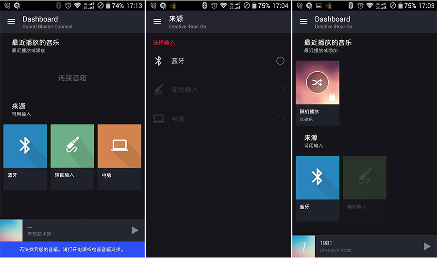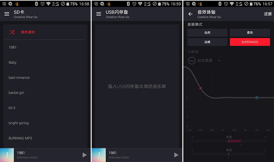 聲霸鑼智能移動版還有配套的手機APP,有安卓和iOS兩種版本,安卓版本的軟件界面如上圖所示。手機通過藍牙與聲霸鑼智能移動版連接之后,可以輕松地使用手機APP來操控聲霸鑼智能移動版,包括播放手機中的音樂,瀏覽及播放聲霸鑼智能移動版擴展存儲卡中的音樂,瀏覽及播放聲霸鑼智能移動版擴展USB閃存盤中的音樂,調節音效等等功能。