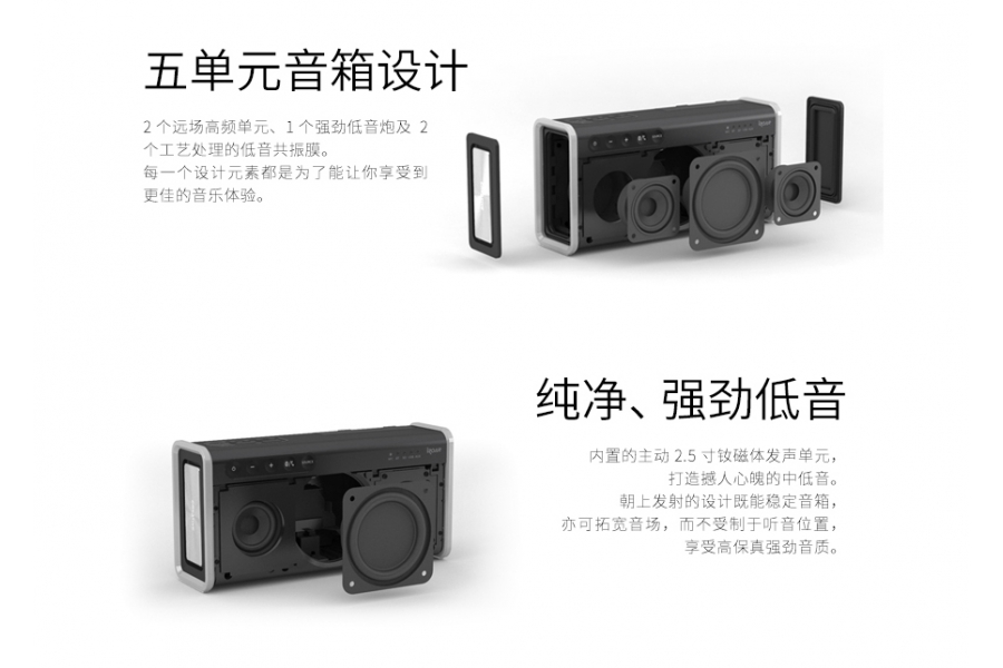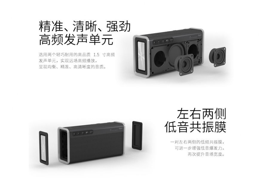 聲霸鑼智能移動版在發聲單元上依舊是五發聲單元,規格與聲霸鑼2代一致。正面中間一枚2.5英寸低頻發聲單元,左右兩邊各一枚1.5英寸高頻發聲單元,音箱側面還有兩個低頻共振膜。