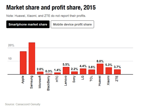 不過(guò)對(duì)于廠商而言,利潤(rùn)率才是它們最關(guān)心的。三星的利潤(rùn)占比為14%,而其它廠商如HTC、微軟、索尼、聯(lián)想等廠商手機(jī)業(yè)務(wù)都是處于虧損狀態(tài)。也就說(shuō),2015年只有蘋(píng)果和三星手機(jī)業(yè)務(wù)實(shí)現(xiàn)了盈利,而其它廠商基本處于“賠錢賺吆喝”的尷尬境地。