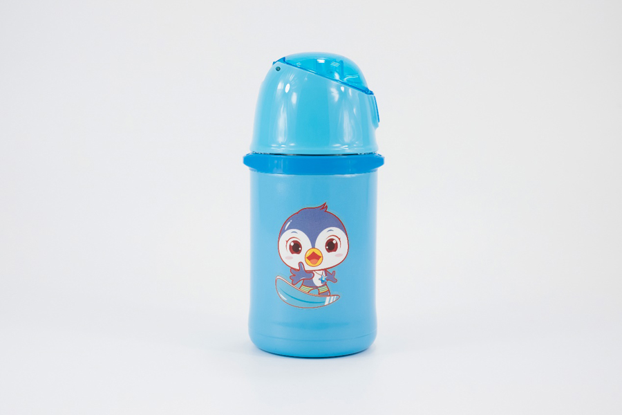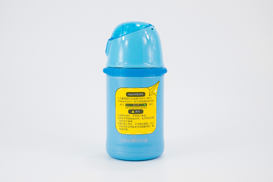 取出水杯,可以看到這款Nado兒童智能保溫杯下半部分使用的是金屬噴漆材質,上半部分為塑料材質,這款水杯使用的金屬材料為食品級304不銹鋼,塑料、硅膠吸管及密封圈也全都是食品級的安全材料。水杯正面貼有一個卡通圖案貼紙,背面貼有一張醒目的黃顏色保溫說明及警示的貼紙。底部有一個圓形塑膠防震墊,上面印有“Coulddrink”的logo以及360ml的字樣。