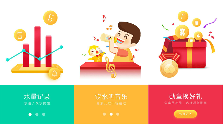 在杯口吸管的四周,有三顆隱藏的白色飲水量指示燈,當小朋友喝到當日飲水量目標的1/3時,飲水量指示燈會亮起1顆,喝到飲水量目標的2/3時,會亮起2顆指示燈,完成當日飲水量目標后,3顆指示燈會全部亮起。每次當小朋友喝完一定量的水后,Nado兒童智能保溫杯都會播放一些音樂并閃爍飲水量指示燈,喝的水越多,燈光和音樂就會越有趣,這一功能構成了這款水杯的飲水激勵功能。