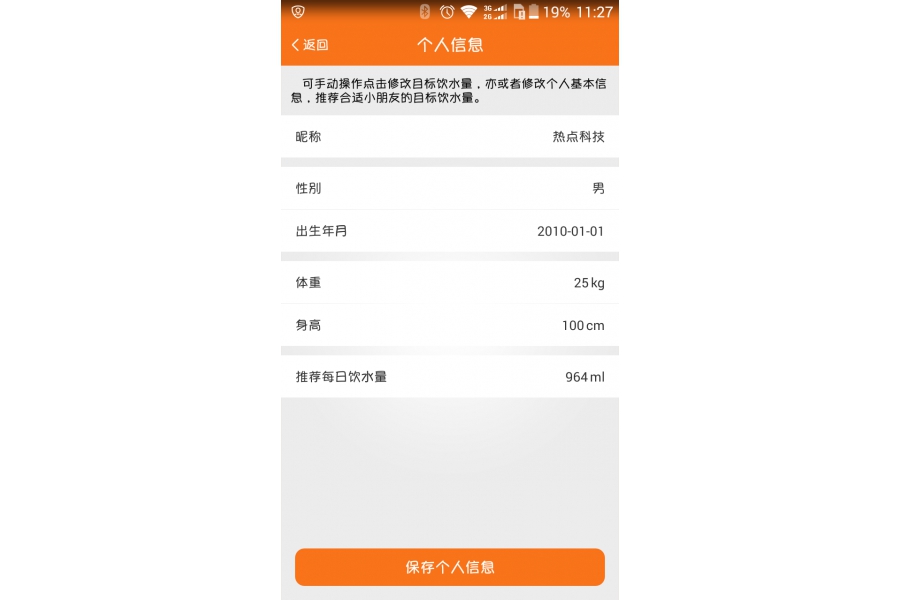 首次登陸賬號后,APP會彈出一個“個人信息”設置框,默認設置為體重25kg,身高100cm,推薦每日飲水量964ml,點擊“保存個人信息”進入APP后,后期這個設置頁面還可以通過設置-水杯設置-飲水目標進入修改。