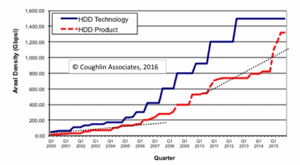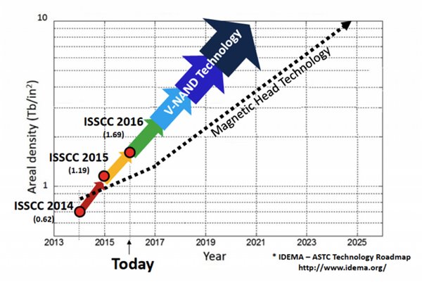 當(dāng)然HDD技術(shù)并沒(méi)有停滯不前,不過(guò)和SSD比起來(lái)就是小巫見(jiàn)大巫了。日前在ISSCC 2016會(huì)議上,Coughlin Associates公司總裁Tom Coughlin就公布了一份研究報(bào)告。這份報(bào)告顯示:SSD硬盤的發(fā)展速度相比HDD機(jī)械硬盤快得驚人。存儲(chǔ)密度從1.19Tbpsi提升到1.69Tbpsi,美光還公布了容量為768GB的TLC 3D閃存,存儲(chǔ)密度達(dá)到了2.77Tbpsi,遠(yuǎn)超HDD硬盤水平,而這只是技術(shù)的剛剛開(kāi)始,未來(lái)SSD的存儲(chǔ)密度到底能達(dá)到多少,上不封頂。