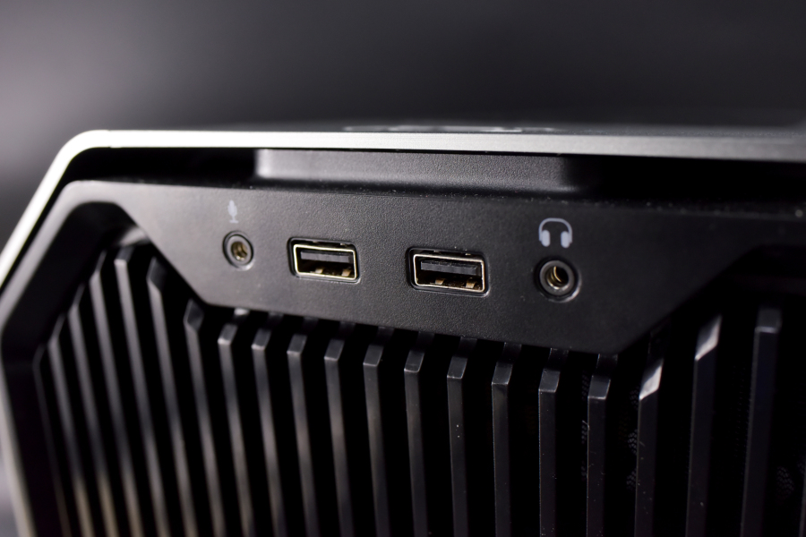 前面板頂部有四個接口,對稱排布,從左至右依次為:麥克風接口、兩個USB3.0接口、耳機接口。