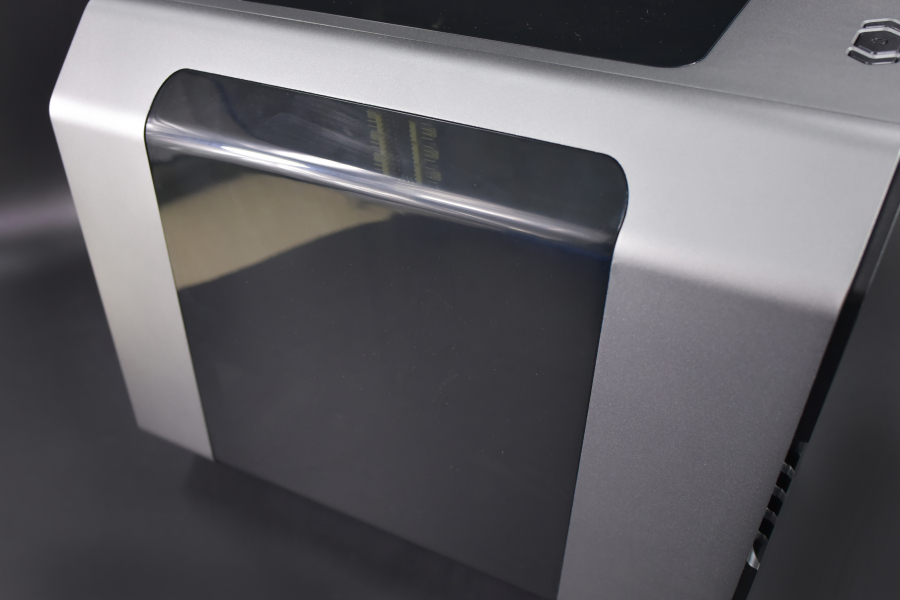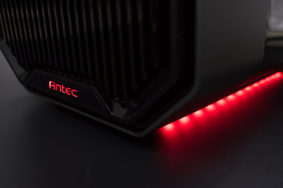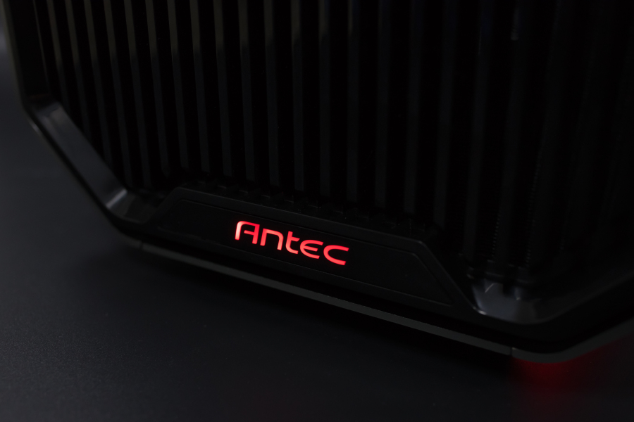 安鈦克CUBE機箱兩個側面和頂面均有大面積的透明亞克力板開窗,比一般的光污染機箱單面開窗做得更為極致。更獨特的是,為了得到渾然一體的效果,亞克力板根據機身的八邊形造型,在轉折處進行了彎曲,與金屬框架渾然一體,帶來了絕佳的觀感。