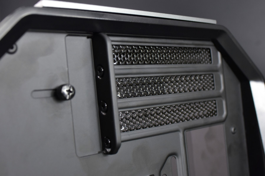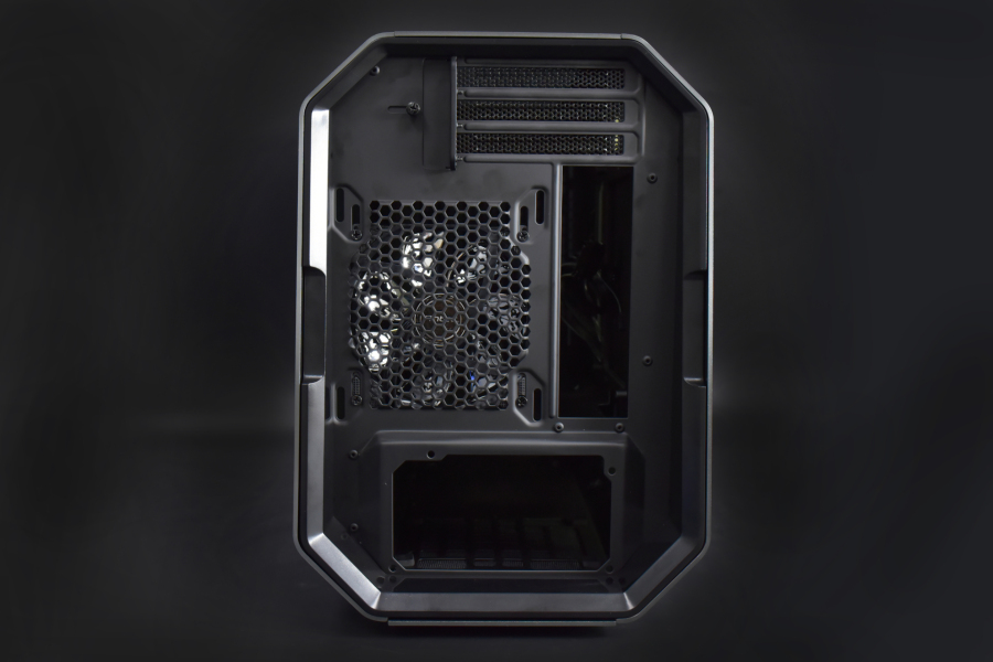 從機箱后側可以看到,由于采用了主板倒置的設計,所以顯卡位置在上,風扇位置靠左。機箱標配一個120mm風扇,但這個風扇位也支持140mm風扇。