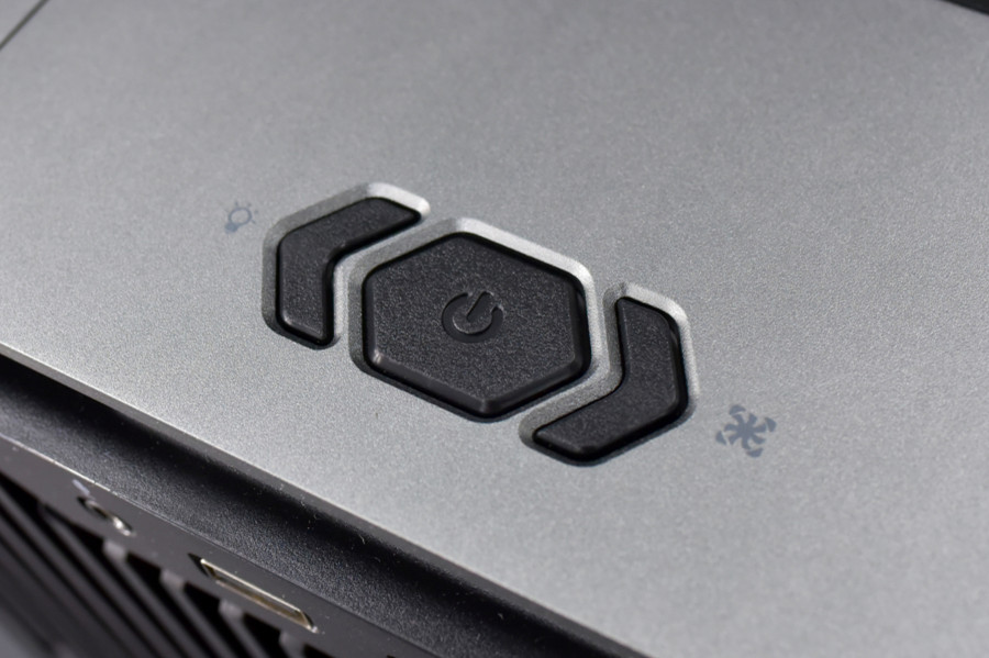 頂部前端為對稱外觀設計的三個按鍵,從左至右依次為:燈光控制鍵、電源鍵、風扇控制鍵。