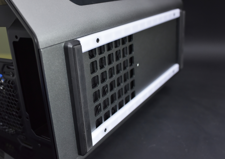 底部前后有兩個防滑條,兩側則為兩條LED燈條,可實現炫目的燈光效果,后部有電源散熱開孔和防塵網。