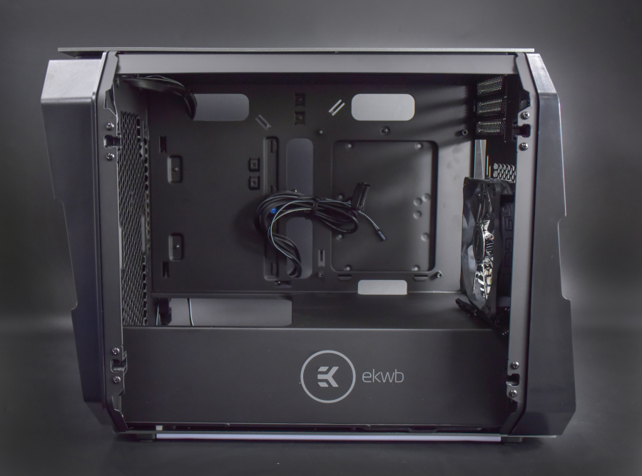 從正面可以看到,內部空間很大,機架尺寸為349mmx239mmx358mm,有近30L空間,這個容積在MINI-ITX板型的機箱中,可以說相當可觀,甚至支持Fanless散熱器。電源倉被分隔,下方有ekwb的logo,這款機箱也是安鈦克與ekwb聯合推出,支持EKWB PREDATOR 240水冷。