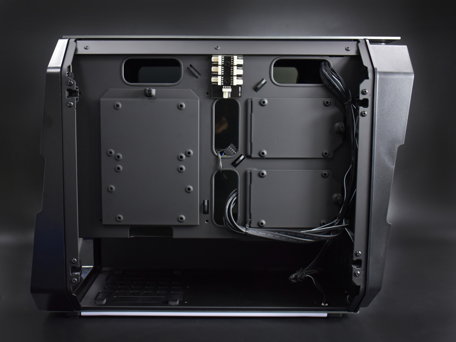 背面的結構也相當地簡潔,顯眼的三個硬盤位,左邊的是3.5英寸硬盤位,該位置也支持當做兩個2.5英寸硬盤位使用;右部為兩個2.5英寸硬盤位。故該機箱支持同時安裝1個3.5英寸硬盤+兩個2.5英寸硬盤;或者同時安裝4個2.5英寸硬盤。