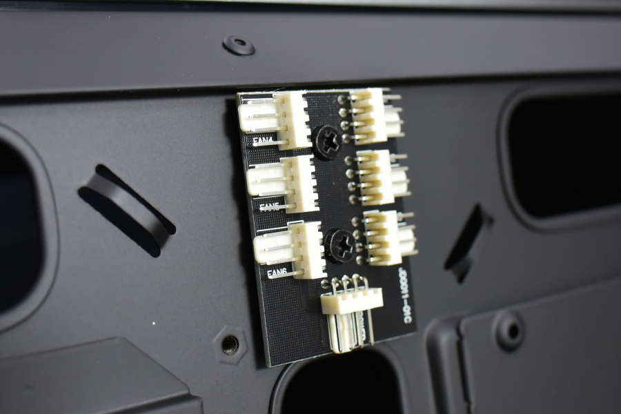 頂部中間為風扇HUB供電板,需要說明的是,底下單獨的接口為輸入口,其余為輸出口,最多支持6個4pin風扇接入口。