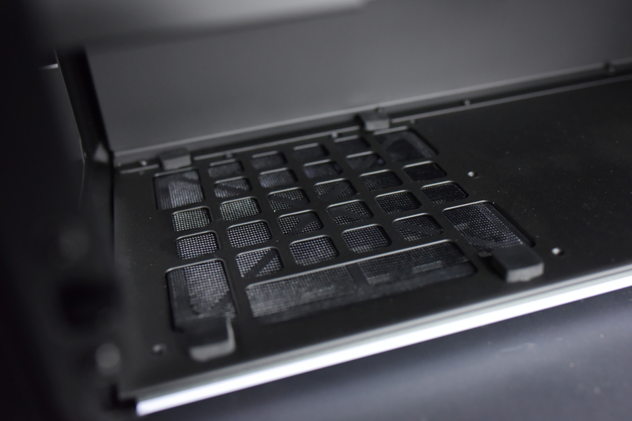 底部電源安裝位有5mm高的支撐墊,支持200mm電源,防塵網可以輕松取下,便于清理。