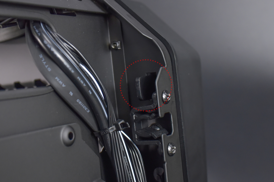 柵欄結構前罩由四角的卡扣固定,想要拆下來的話,可以從機箱內部解開四角的卡扣。