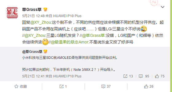 雖說最近有不少消息稱LG正在大力研發手機OLED屏幕,將為“真旗艦”LG V30配備其自家的柔性OLED屏幕。但小米被LG坑了一次之后吸取了教訓,這不,手機圈業內知名人士@草Grass草在他的個人微博上稱:“小米科技與三星SDC就AMOLED柔性屏供貨問題重新開始談判。預計如果談判順利,下半年新機(Note 3/MIX 2?)開始導入”。另外他還表示屏幕供貨商不只是三星這一家,其中依然有LG和國產廠家,但應該會根據不同的機型分開供應。