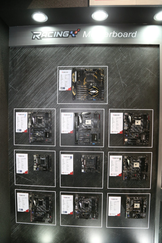 映泰的展臺(tái)采用了相當(dāng)酷炫的科技加賽車風(fēng)布置,頂上的LED燈條全彩循環(huán),呼應(yīng)電競主板特色,顏值高性能足,十足映泰范兒!