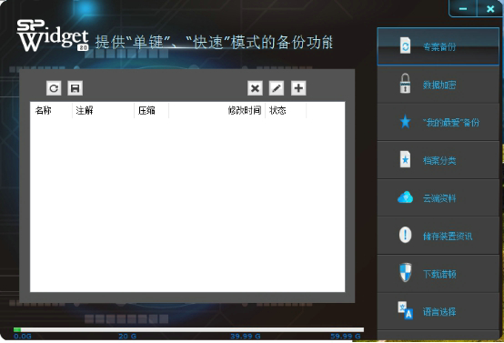 SP廣穎全系列U盤產品皆具備終身保固服務,并同時隨產品附贈SP Widget免費下載軟件,軟件提供固定排程的備份功能、供檔案數據加密保護、還原與備份Internet Explorer、Firefox、Google Chrome書簽功能、檔案數據分類、轉存至行動存儲裝置服務、在線維護您的云端硬盤數據功能等七大功能,幫助用戶有更好的產品體驗。
