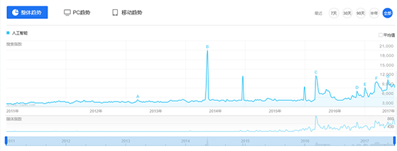 根據(jù)百度指數(shù)表明,人工智能近來勢頭越來越盛。去年“阿爾法狗”打敗李世石,今年升級歸來的“阿爾法狗”又完虐柯潔。每個事件都引爆觀眾的眼球。