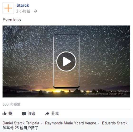 小米MIX系列設(shè)計師,也是國際設(shè)計大師菲利普·斯塔克今日在其FaceBook主頁發(fā)布了小米MIX 2的設(shè)計概念視頻,極具張力的全面屏設(shè)計十分驚艷,令人嘆為觀止。